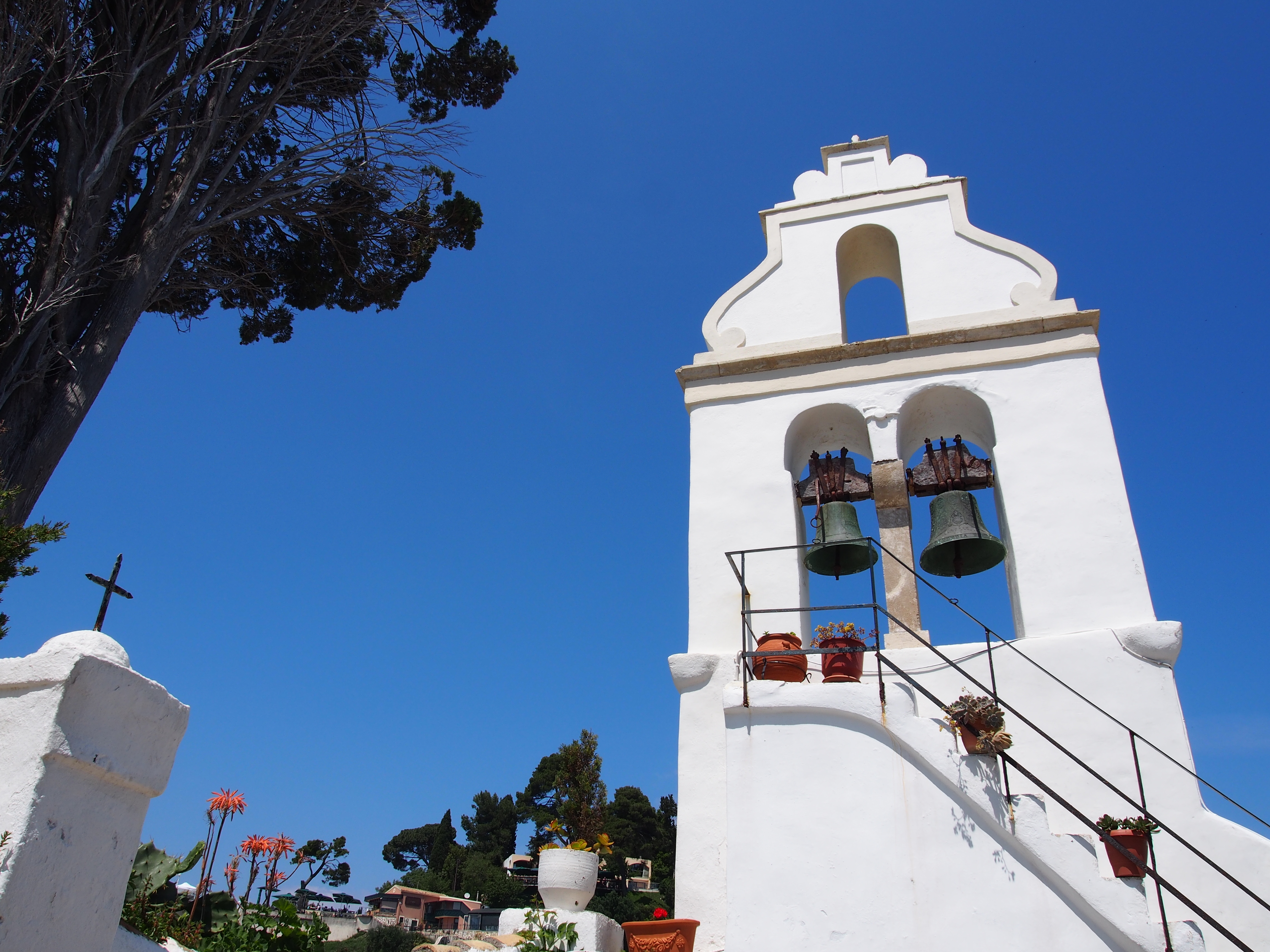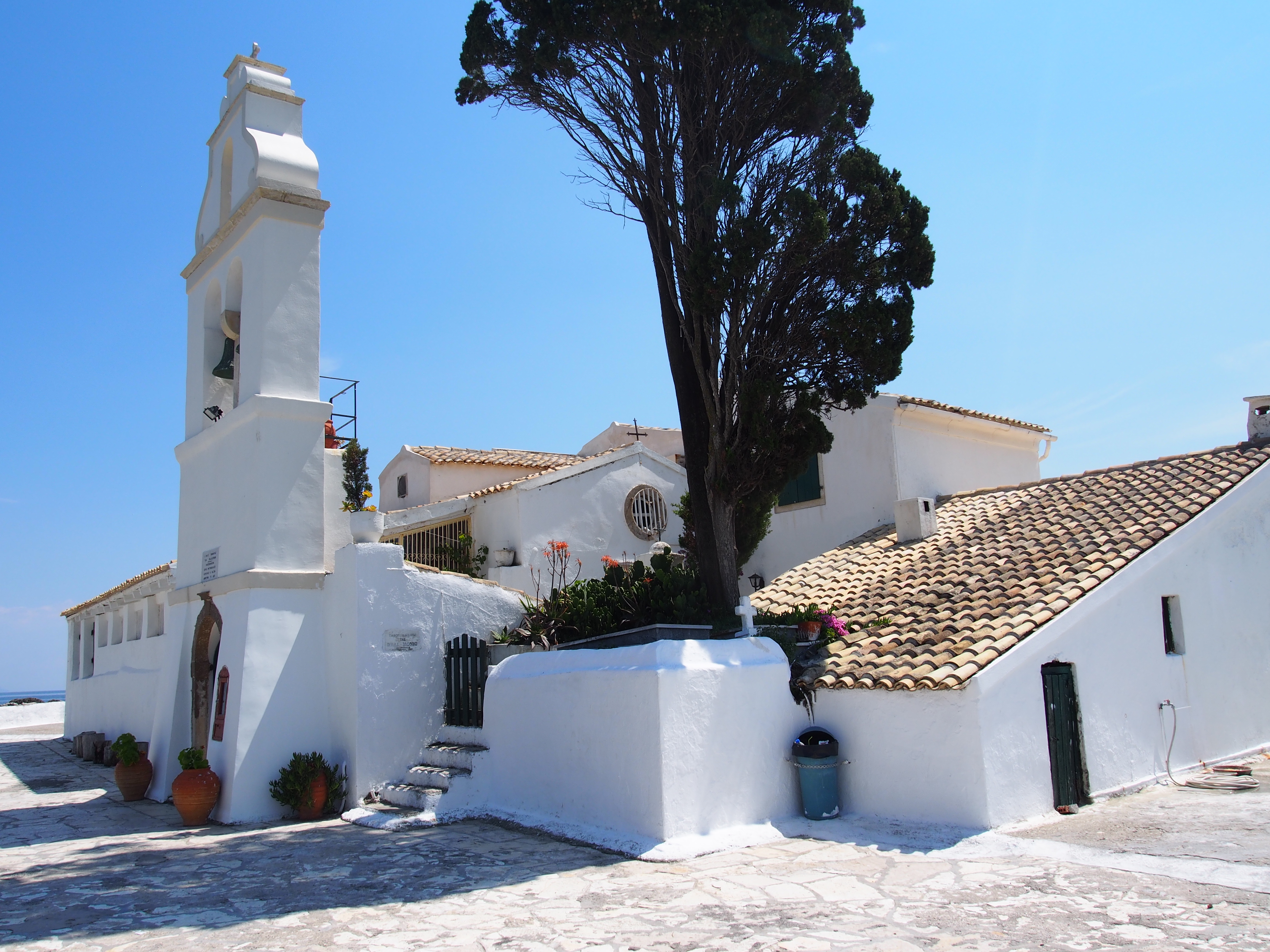 Walking past the cannon, through a café and down the stairs, this view greeted me: tiny Pontikonisi or Mouse Island, and the Vlacherna Monastery.